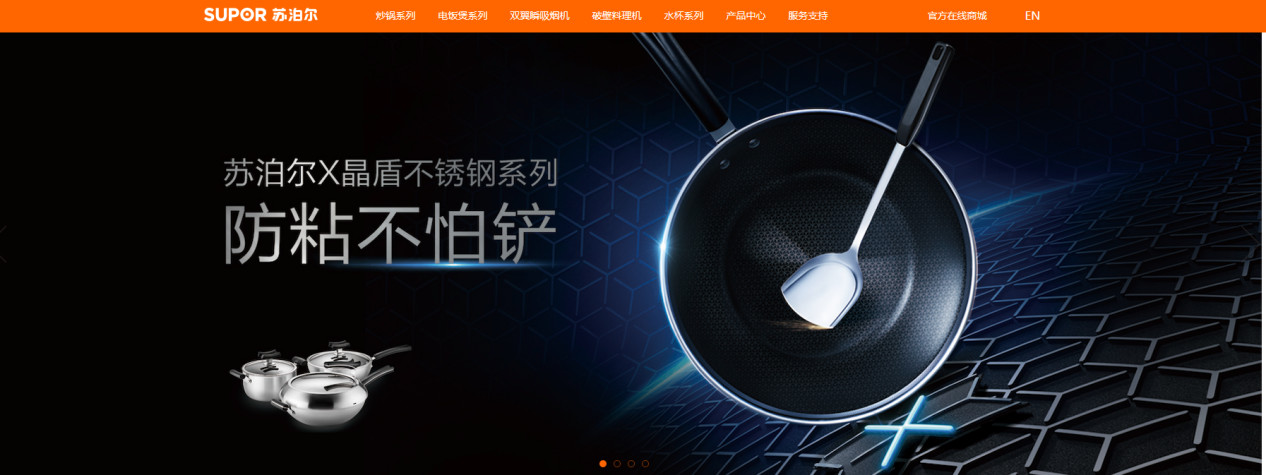 但是,打开苏泊尔的官方网站时,第一个宣传图片是苏泊尔×晶盾不锈钢系列锅具,正是康巴赫声明中指出的苏泊尔可疑侵权产品。
