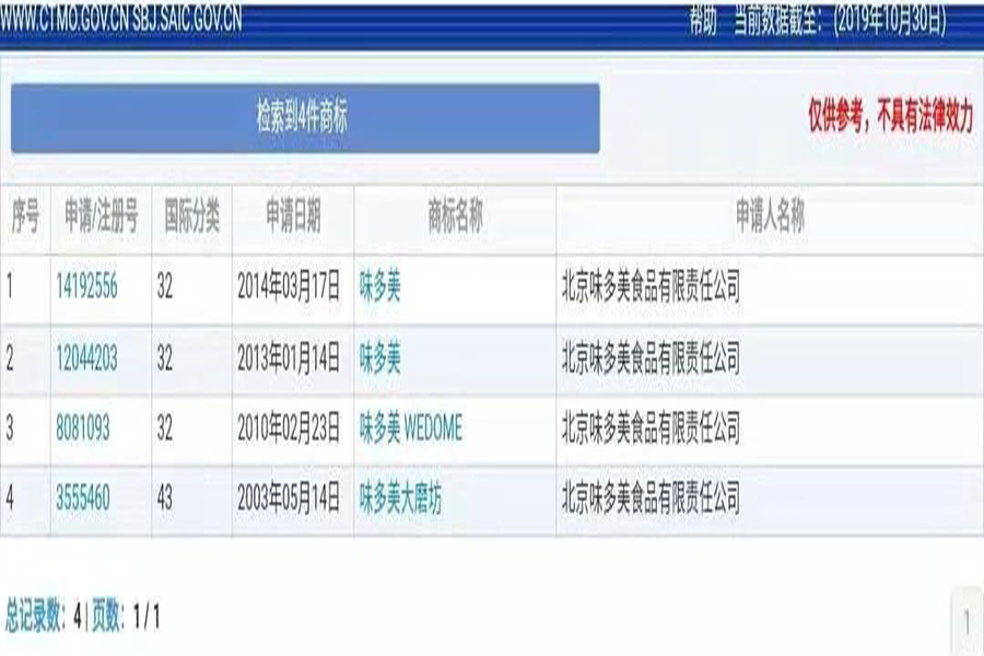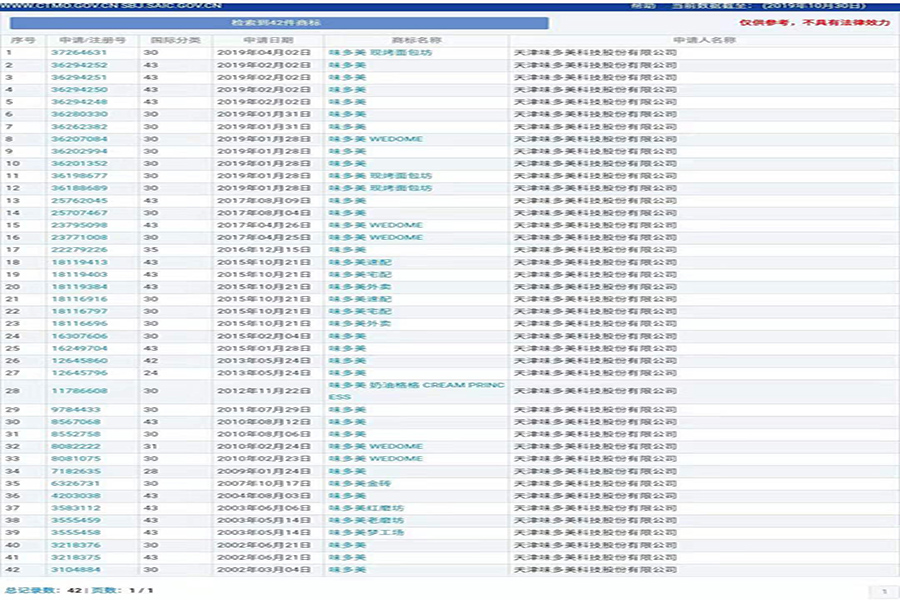 据了解,2018年10月北京味多美将主营业务中使用的注册商标(包括“味多美”)转让给天津味多美科技股份有限公司(以下简称“天津味多美”,北京味多美和天津味多美是关联公司)。根据商标网查询,天津味多美共申请与“味多美”相关的商标42个,主要类别有24类、30类、35类、42类、43类等。