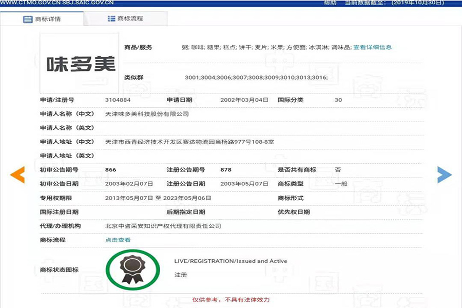 天津味多美拥有的最早申请注册的“味多美”商标是2002年申请,2003年注册成功的。