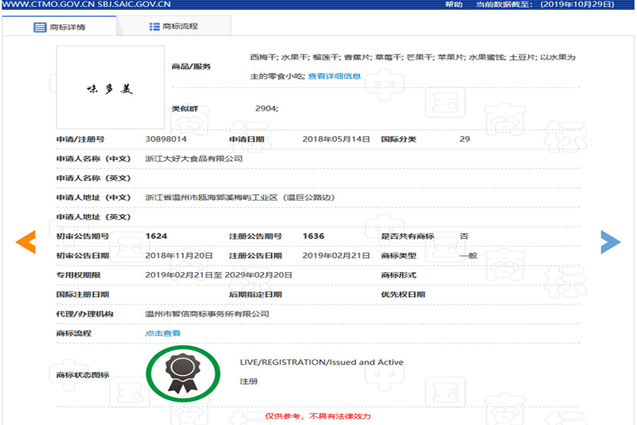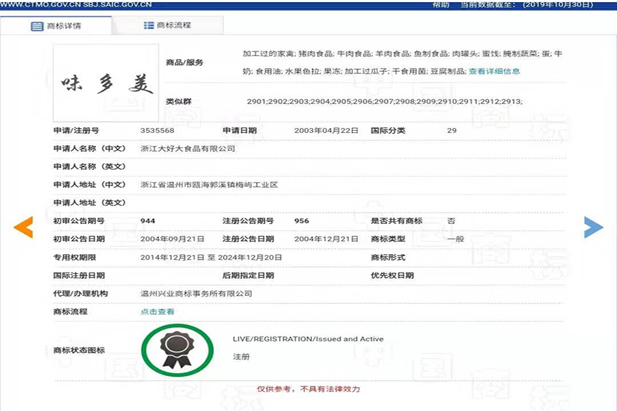 根据企查查的数据,大好大在2019年10月15日再次申请了“味多美”第29类商标,目前商标网尚未公开该商标的详细信息。在10月24日至26日举行的2019天津秋季全国糖酒会上,大好大推出了“味多美”品牌烤肉系列和果干系列产品。