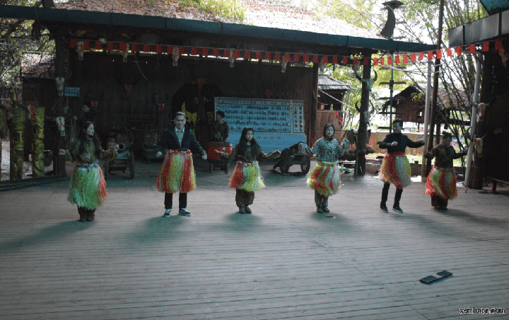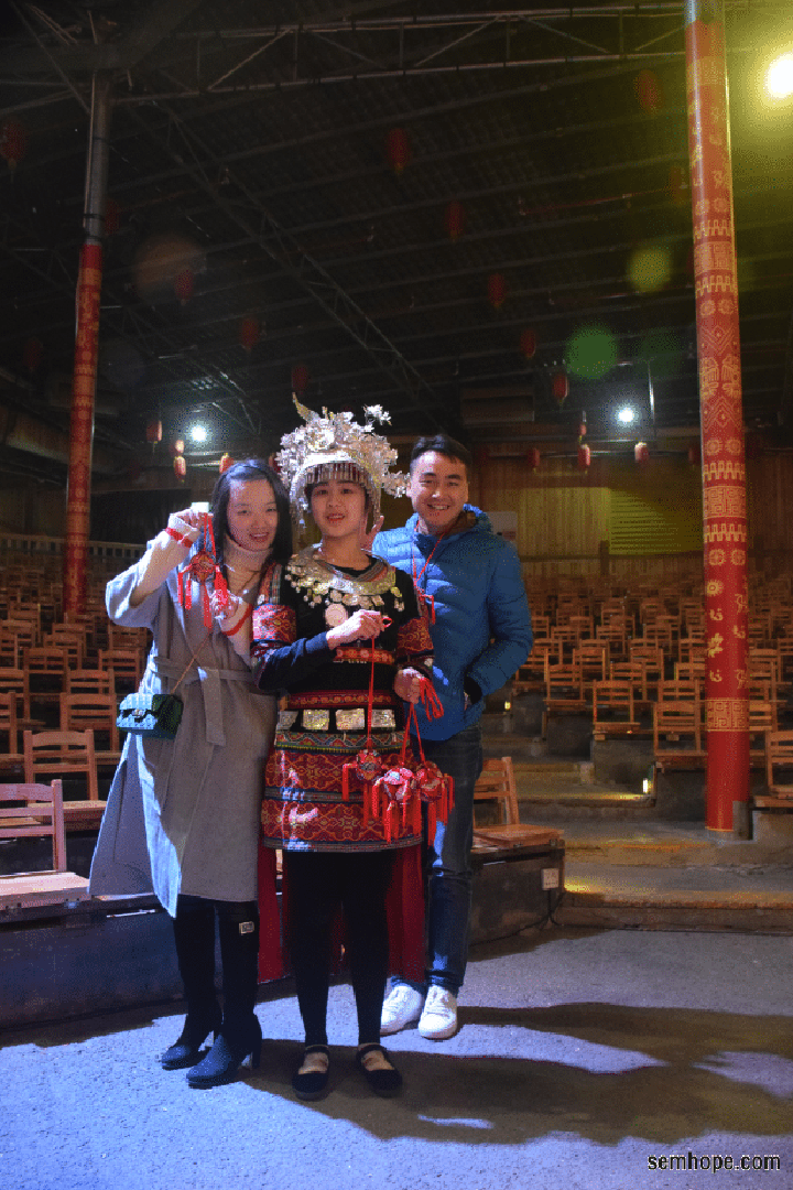 新电影完了之后呢,自然少不了去看原汁原味的苗族舞蹈,舞蹈看不到山美看不到水美,只看到人美(从右边猥琐的笑容中就可以衬得出来人有多美了),依稀记得这位美女合完照之后一路狂奔的回到了后台,仿佛感受到了从未感受过的惊吓。