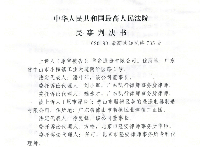 华帝被诉洗碗机专利侵权,美的一审、二审均胜诉
