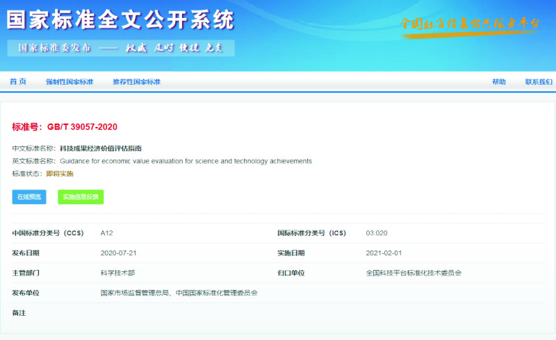 近日,市场监管总局(标准委)批准发布212项重要国家标准,其中,《科技成果经济价值评估指南》国家标准也正式公布,2021年2月1日实施。