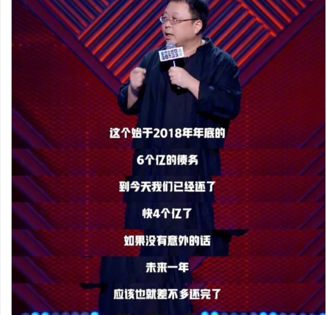 今年9月23日,在《脱口秀大会》总决赛上,罗永浩表示,6亿债务已经还了4亿,剩下的预计一年内还清。