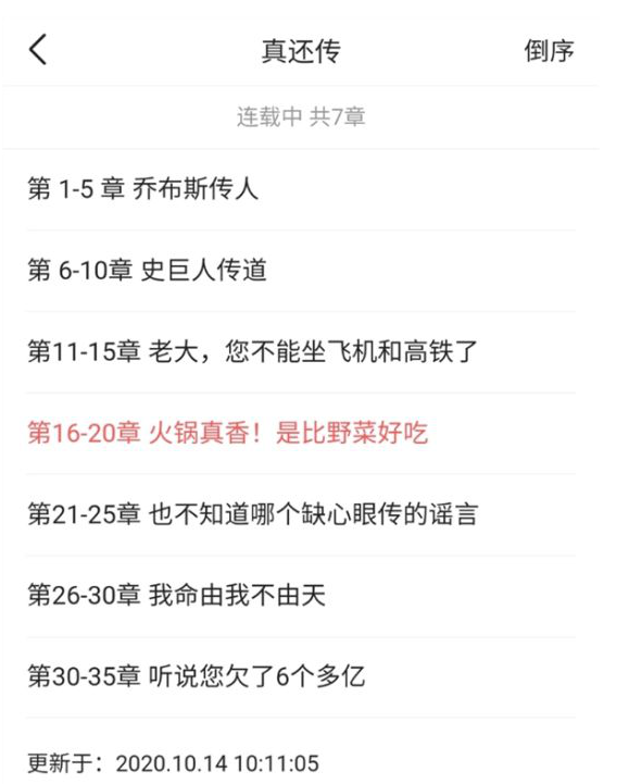 目前,该小说已连载 35 章,从标题可以看到“乔布斯传人”、“不能坐飞机和高铁”、“欠了 6 个多亿”等与罗永浩关联的信息。