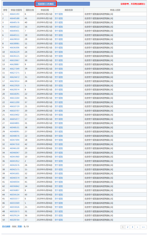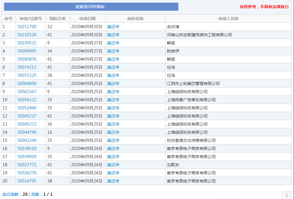 而截止2020年10月15日,已有20件“真还传”商标申请,其中包括11个申请人,申请类别包含第16类办公用品、第35类广告销售、第36类金融、第41类教育娱乐等多个领域。