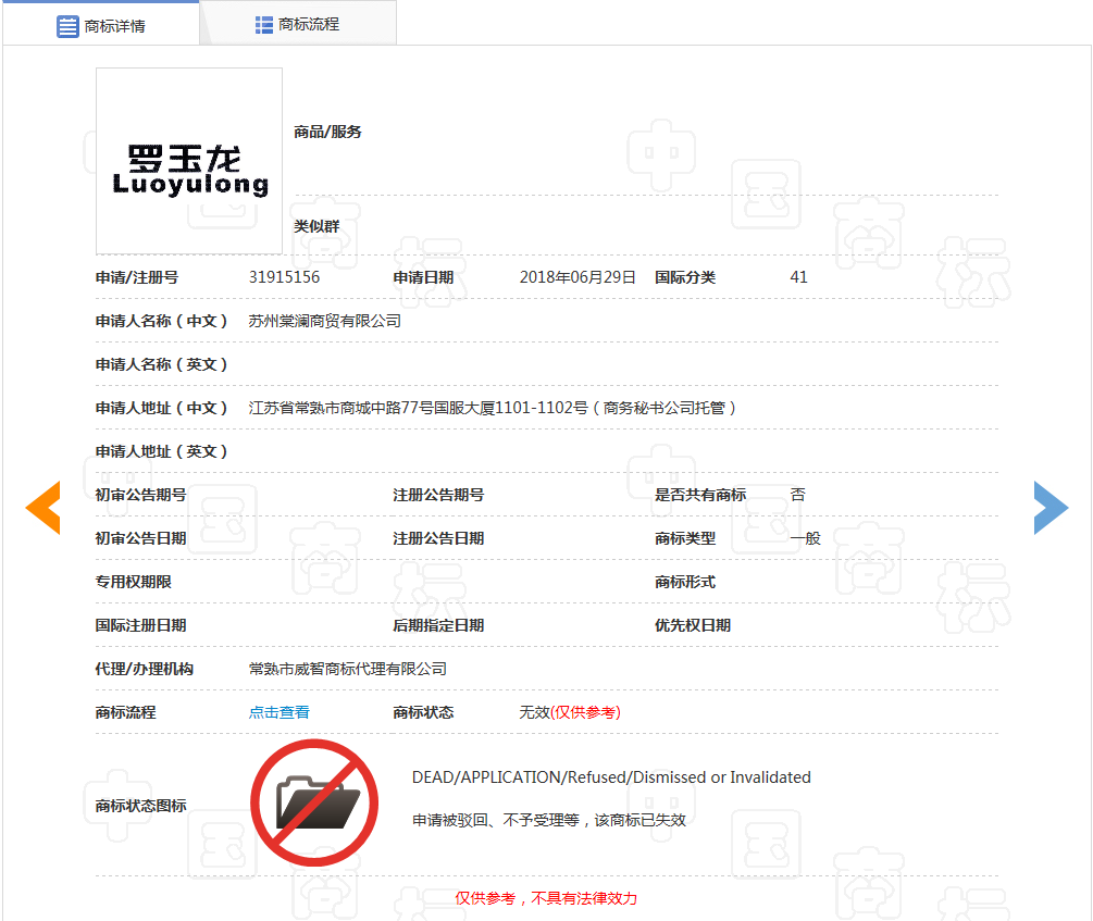 商标局网站查询得知,只有一件第31915156号“罗玉龙”商标信息,苏州棠澜商贸有限公司申请于2018年6月29日,目前处于无效状态。