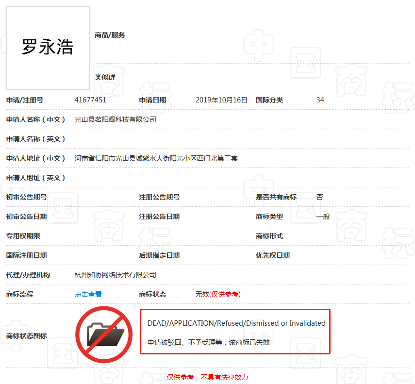 2019年10月16日光山县茗阳阁科技有限公司,申请了第一件第41677451号“罗永浩”商标,不过该商标目前属于失效状态。
