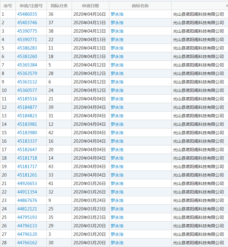 2020年3月20日至4月16日,不到一个月的时间,光山县茗阳阁科技有限公司陆续又在第29类食品、第30类方便食品、第36类金融物管等类别申请了28件“罗永浩”商标。