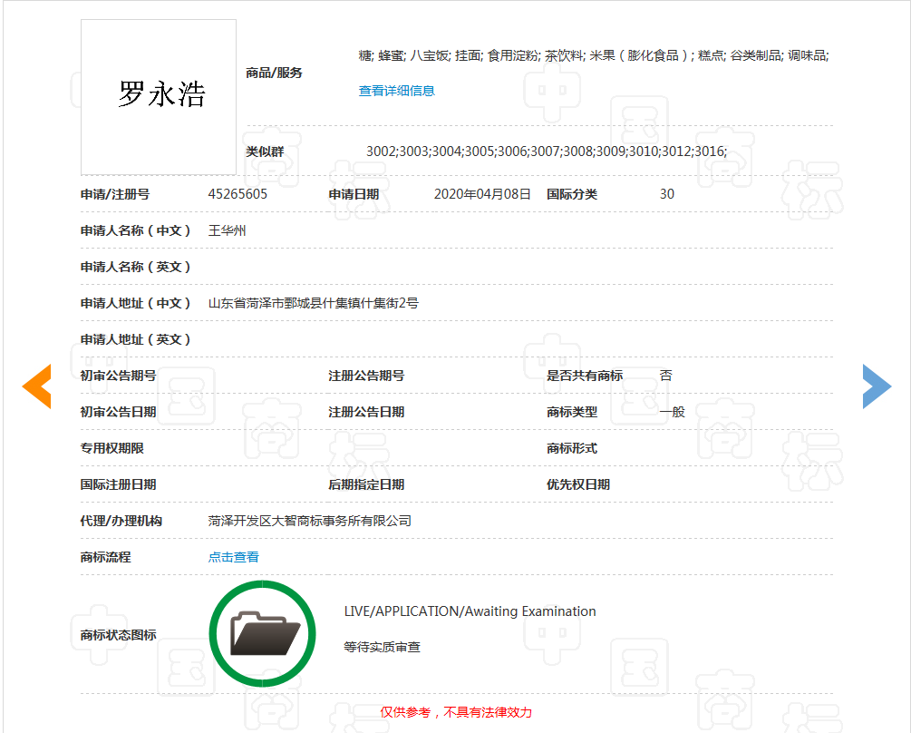 在这期间,也有一些个人在第29类食品、第30类方便食品、第35类广告销售等类别申请了“罗永浩”商标,目前均处于等待实质审查阶段。