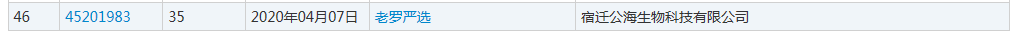 另一件则是由宿迁公海生物科技有限公司于2020年4月7日申请的第45201983号商标,服务于为零售目的在通信媒体上展示商品; 为商品和服务的买卖双方提供在线市场; 特许经营的商业管理; 通过全球计算机网络提供商业信息; 替他人推销。