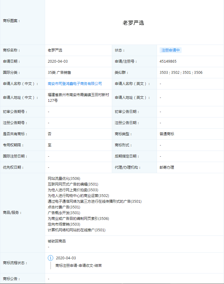 除了“罗永浩”商标被抢注以外,“老罗严选”也没逃过被抢注的魔掌。