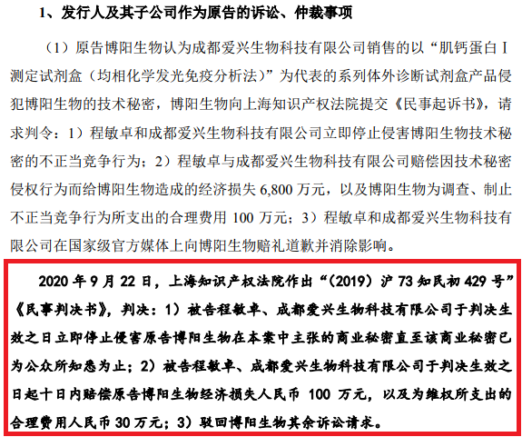 根据10月15日科美诊断IPO审核阶段更新的最新信息显示,上海知识产权法院在9月22日作出本案的《民事判决书》,判决:(1)程敏卓、爱兴生物停止侵害博阳生物(注:已被科美诊断收购)的技术秘密;(2)赔偿经济损失100万元,及合理维权支出30万元;(3)驳回其余诉讼请求。