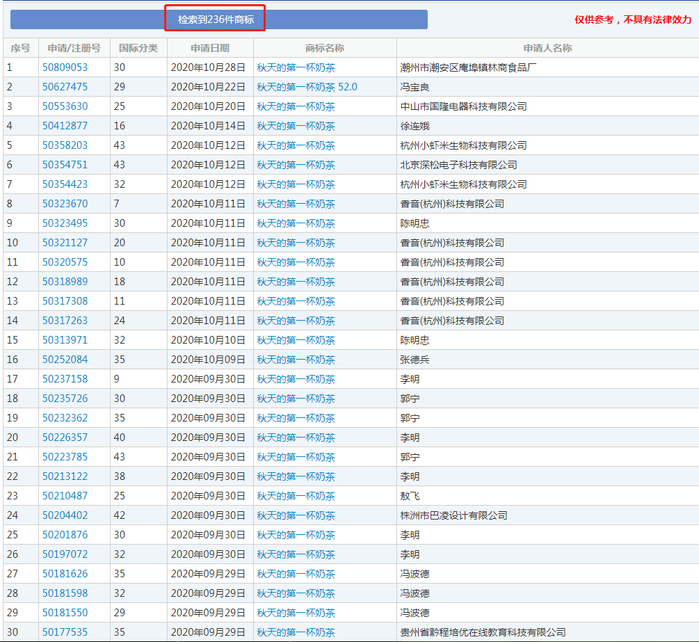 自从“秋天的第一杯奶茶”梗出现,已有相关商标注册申请。而据商标局官网显示,截止到10月28日,已有236件“秋天的第一杯奶茶”商标申请注册。