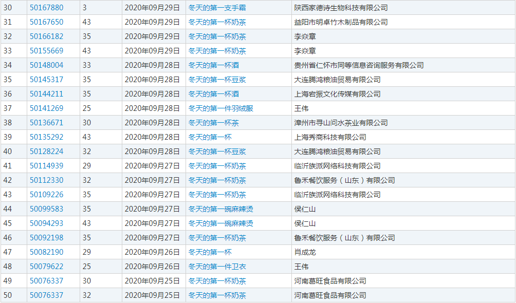 不过,机智的本商标注册代理人发现,除了奶茶之外,火锅、咖啡、卫衣、麻辣烫、羽绒服、豆浆等一系列与冬天息息相关的美食或是物品也统统难逃被注册的命运。