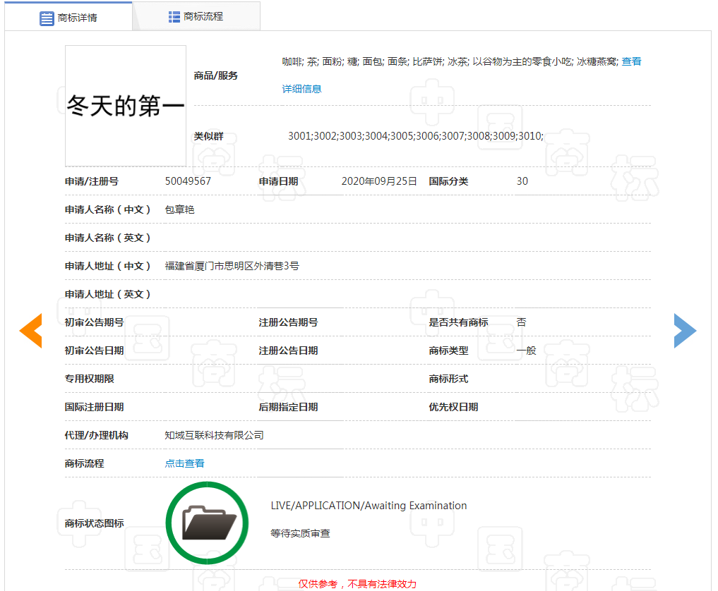 甚至还有深圳商标注册申请人直接申请“冬天的第一”商标的,商品服务类别包括了咖啡;茶;面粉;糖;面包;面条;比萨饼;冰茶;以谷物为主的零食小吃;冰糖燕窝等等。