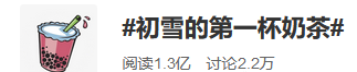 那么,既然能造出“冬天的第一口西北风”,“初雪的第一杯奶茶”自然也不想缺席。截至目前,新浪微博#初雪的第一杯奶茶#话题阅读一超1.3亿。