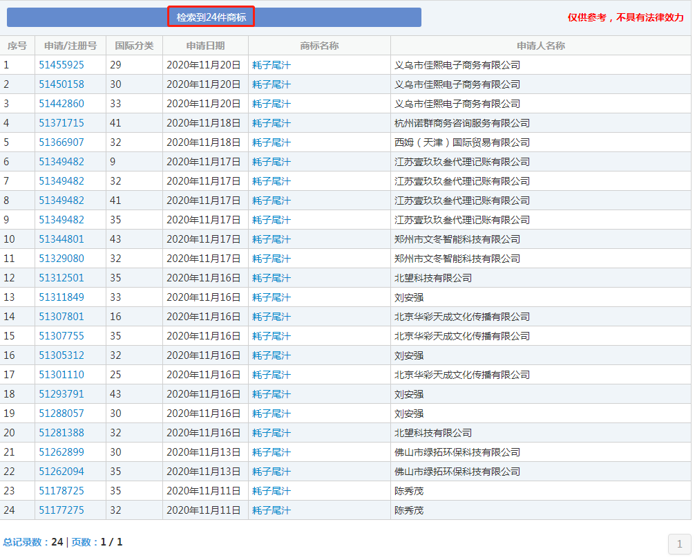 “耗子尾汁”走红后不久,小编就发现有不少企业及个人申请了商标注册。2020年11月25日,通过商标局官网查询,小编发现已有24个“耗子尾汁”的商标注册申请中,商标申请类别分别有第41、32、9、35、43等多类。