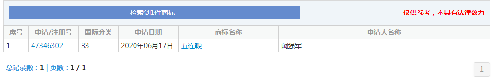 据中国商标网显示,截止2020年11月22日,只有一个“五连鞭”商标申请。