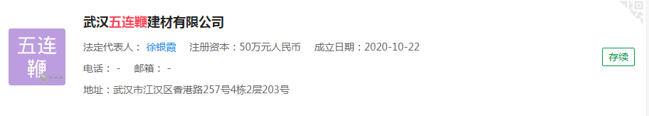 商标申请注册、公司注册,一个也不能落下。据企查查显示,武汉五连鞭建材有限公司成立于2020年10月22日。