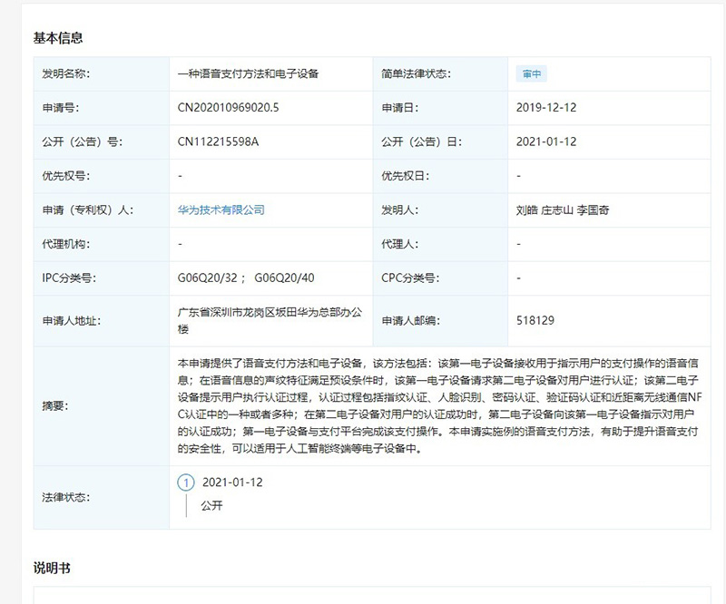 2021 年 1 月 12 日,(深圳)华为技术有限公司公开一项名为 “一种语音支付方法和电子设备”的专利,公开号为 CN112215598A,申请日期为 2019 年 12 月。