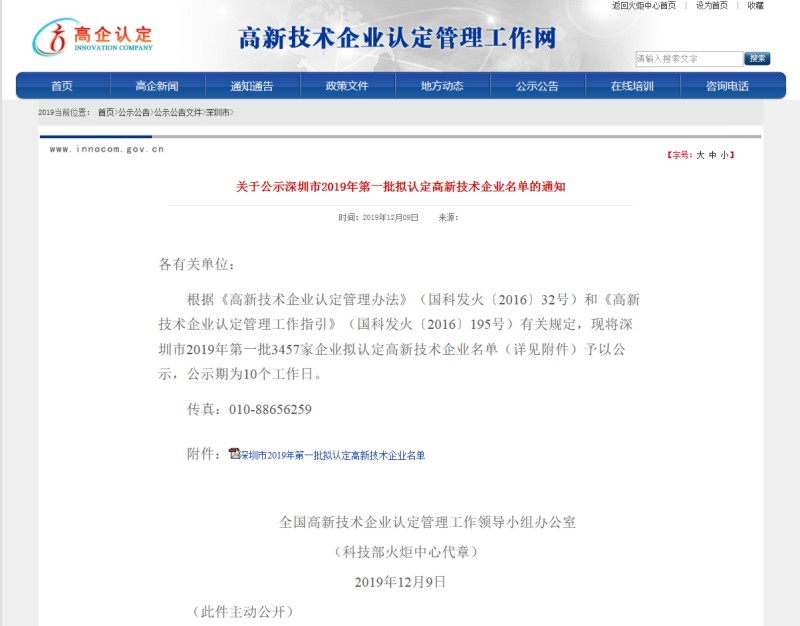 根据《高新技术企业认定管理办法》(国科发火〔2016〕32号)和《高新技术企业认定管理工作指引》(国科发火〔2016〕195号)有关规定,现将深圳市2019年第一批3457家企业拟认定高新技术企业名单(详见附件)予以公示,公示期为10个工作日。