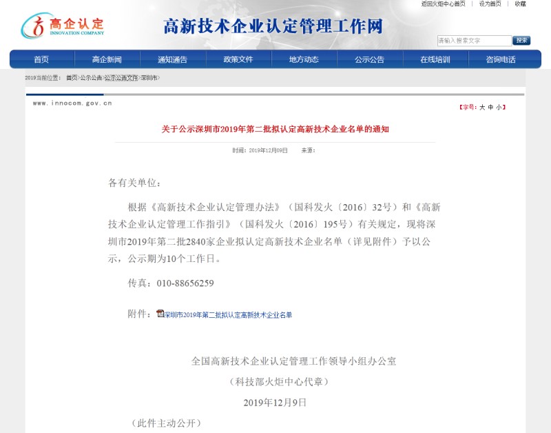 根据《高新技术企业认定管理办法》(国科发火〔2016〕32号)和《高新技术企业认定管理工作指引》(国科发火〔2016〕195号)有关规定,现将深圳市2019年第二批2840家企业拟认定高新技术企业名单(详见附件)予以公示,公示期为10个工作日。