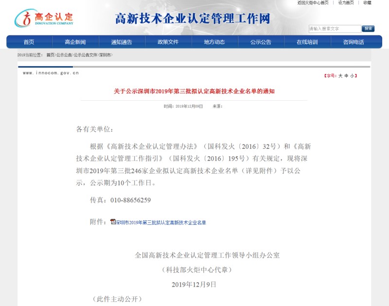 根据《高新技术企业认定管理办法》(国科发火〔2016〕32号)和《高新技术企业认定管理工作指引》(国科发火〔2016〕195号)有关规定,现将深圳市2019年第三批246家企业拟认定高新技术企业名单(详见附件)予以公示,公示期为10个工作日。