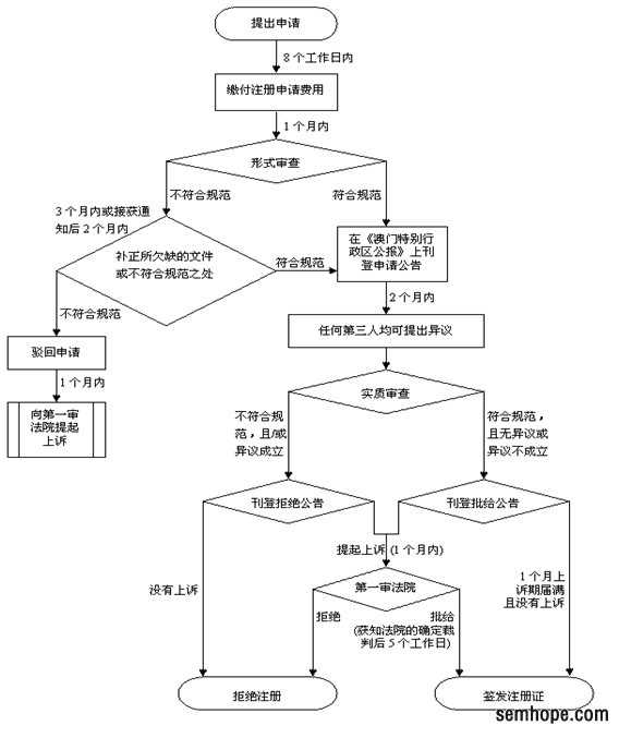 知识产权厅在收到申请后1个月内会对申请作出形式审查,以查核申请的形式,申请表的填写及附件是否符合有关法例的条文,并对有关产品或服务进行分类。若申请符合规定,有关申请将会在递交后的第2个月首个星期三出版的第2组《澳门特别行政区公报》内刊登通告。在没有声明异议的情况下,知识产权厅将自有关申请的通告刊登于《澳门特别行政区公报》后6个月内发出商标注册审查报告。商标的注册申请获得核准后,将在每月首个星期三得第2组《澳门特别行政区公报》内刊登通告,内容包括商标注册申请的编号及申请人名称。